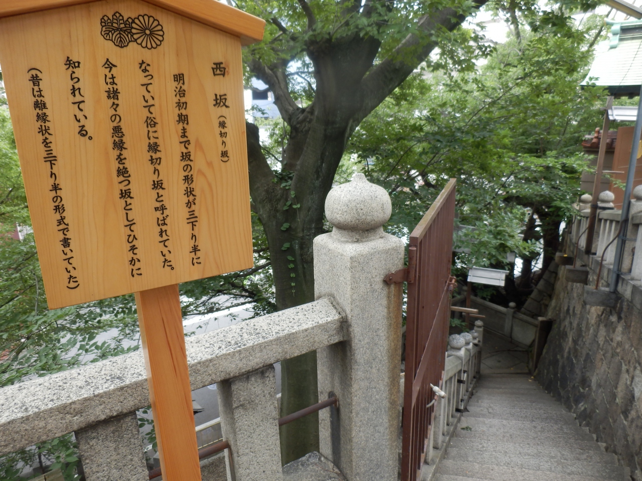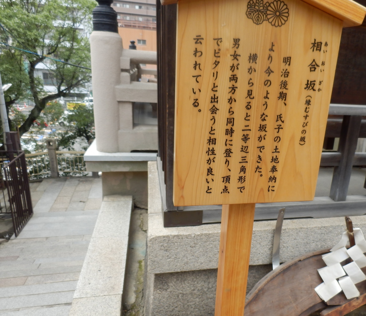 大阪にある高津宮(高津神社)は上町台地の西はずれにあり神社の西は急な下り坂になっている、参道の一つに、男女が坂の下から両側に分かれて登り頂点でピタリと合うと相性があるとされている。この坂を相合坂別称縁結びの坂といわれている、この すぐ横に西坂がありこっちは、縁切り坂といわれている、