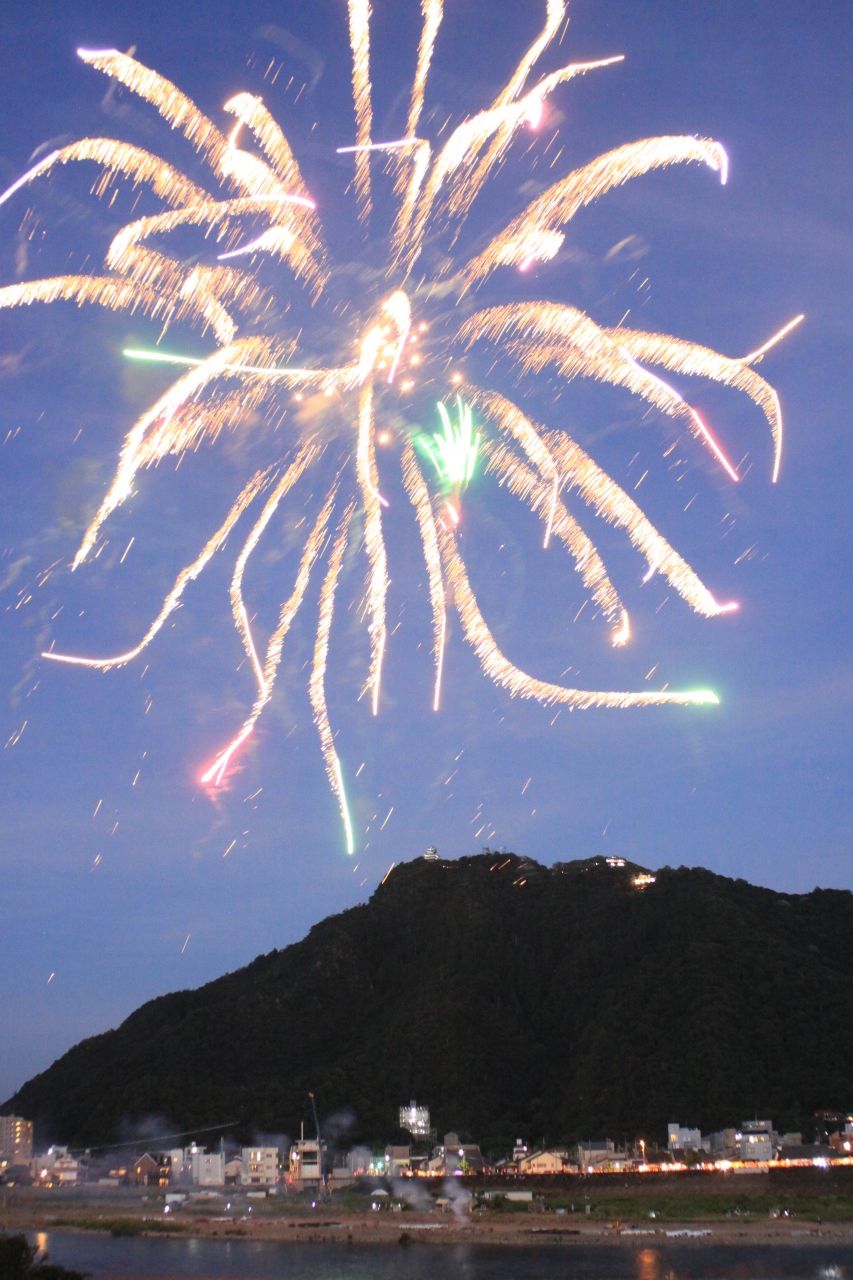 金華山をバックに次々と打ち上がるスターマインは頭上で弾けて山々にこだまします。