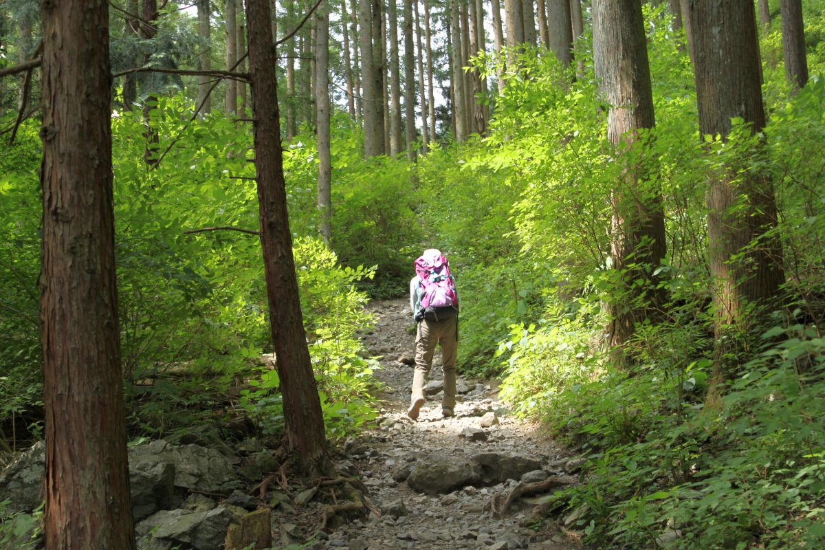 山道は一般的登山道がほとんどですが、途中、意外に荘厳な切り立った岩場もあり、そこには沢が流れています。