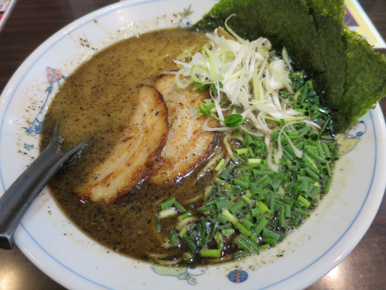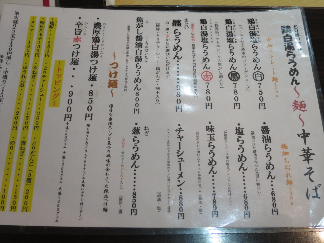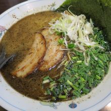 ラーメンは鶏白湯塩ラーメンが基本で、白、黒、赤の3種の味付けがあります(他にもつけ麺、冷やし中華などもあります)。今回は黒ゴマ、にんにく風味の黒を戴きました。鳥だしが利いた細麺は愛称が良く美味しいです。
