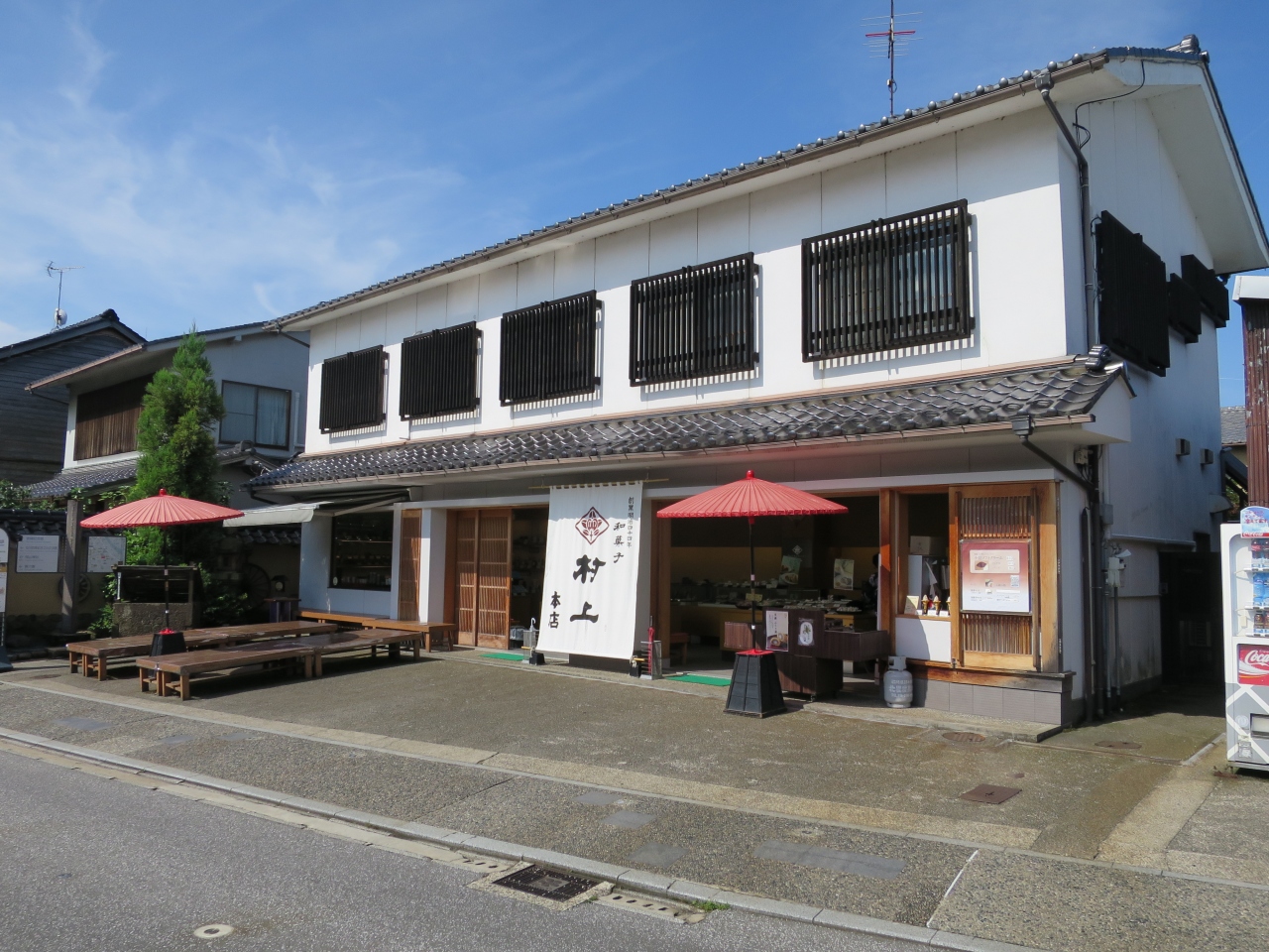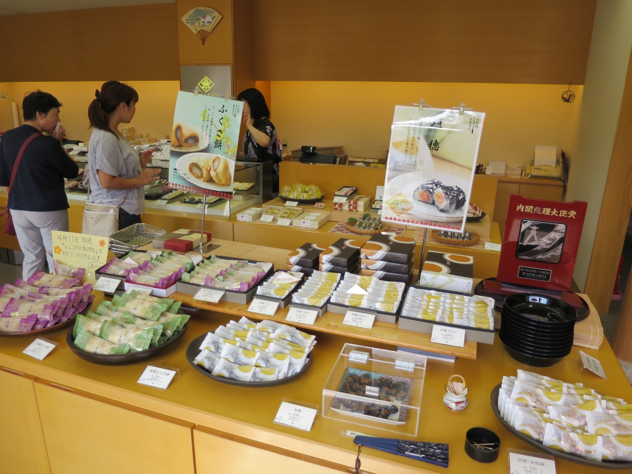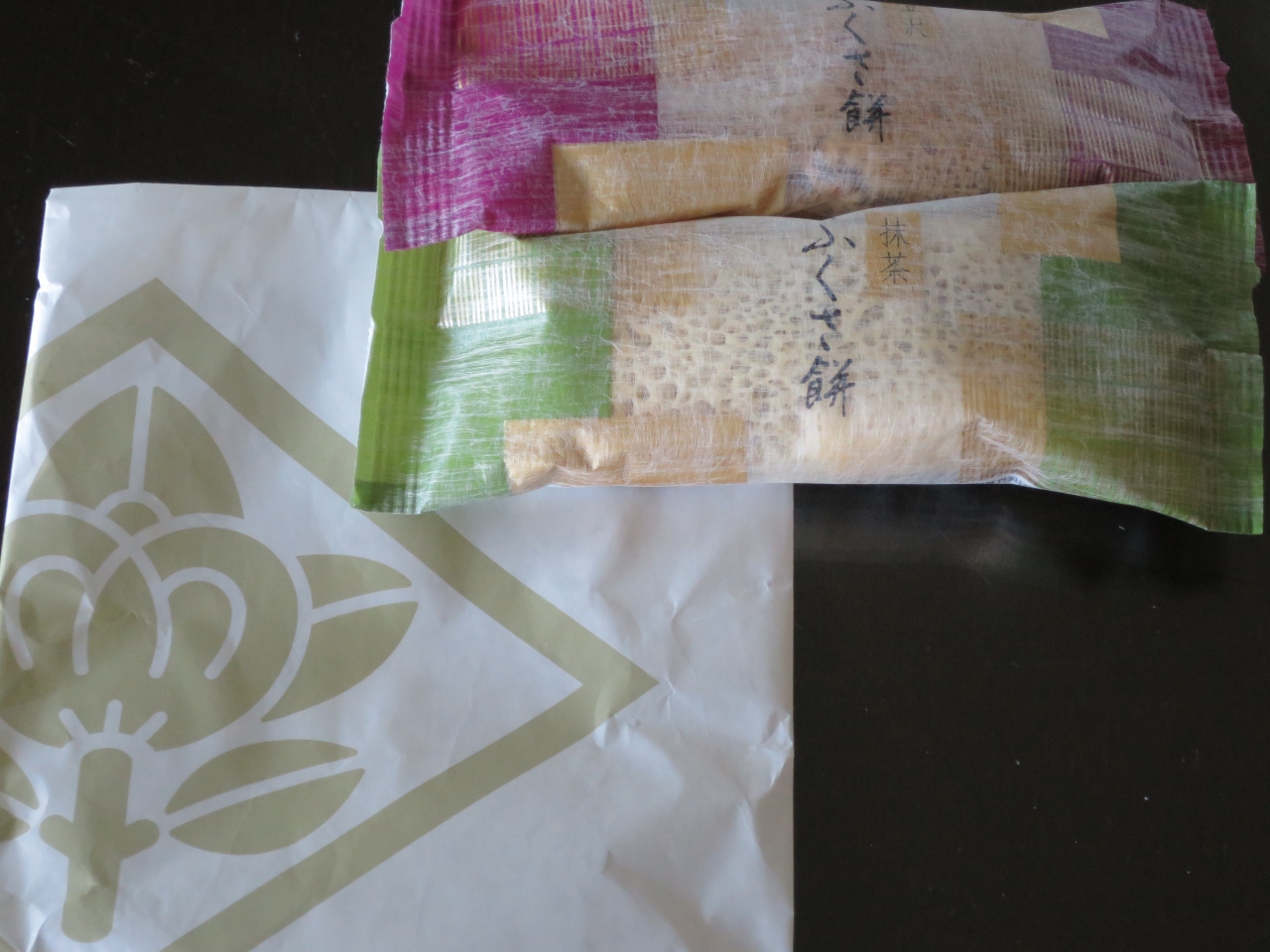 金沢 長町の武家屋敷にほど近い大野庄用水沿いにある和菓子の老舗です。明治44年創業の老舗の代表菓子はあんこを求肥で巻いたふくさ餅。定番の黒糖ふくさ餅以外にも、夏は抹茶ふくさ餅がありました。2種を1個づつ買いましたが、意外に大きいです。