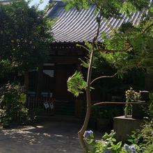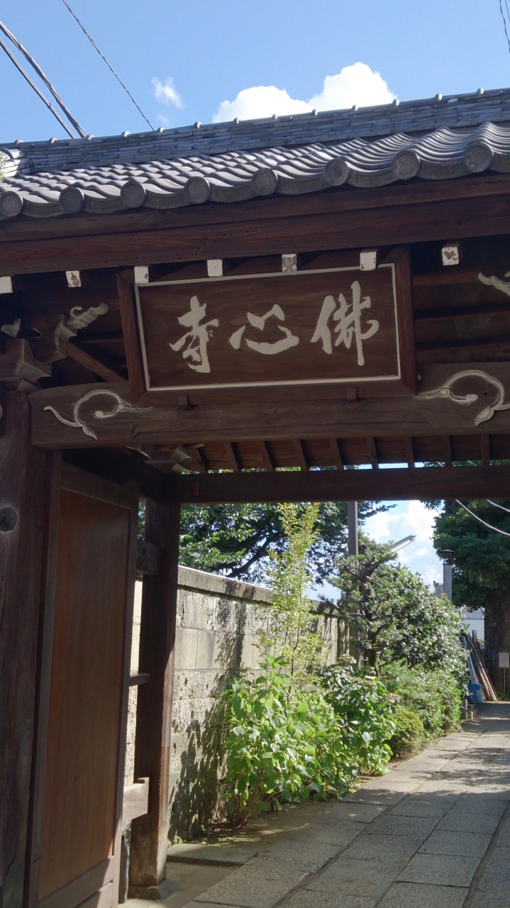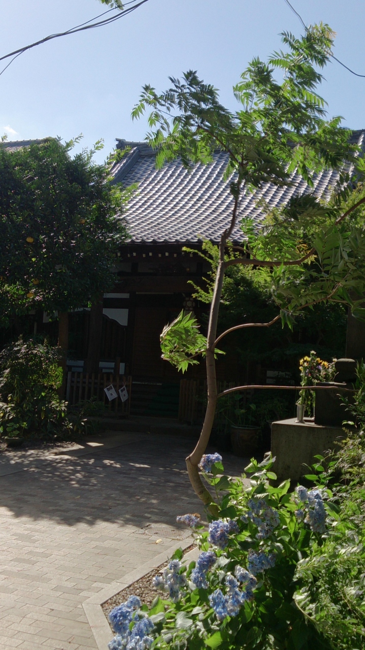 お隣にある近代的な妙泉寺と対照的な伝統的スタイルの谷中っぽい雰囲気の寺院。山門は狭い間口、いっぱいに建っており、比較的新し感じの木造建築ですが、白文字で寺院名が記された額が掲げられており、存在感のある山門だと思います。石畳の境内を進むと左手に墓地、右手に本堂があって、本堂側は巨木を含めて、自然な感じで緑があって豊かな感じになっていますが、手入れはしっかりとされています。本堂そのものは、谷中界隈では、ごく標準的な建物ですが、夏の緑豊かな木々と合わさった風景が良い雰囲気です。