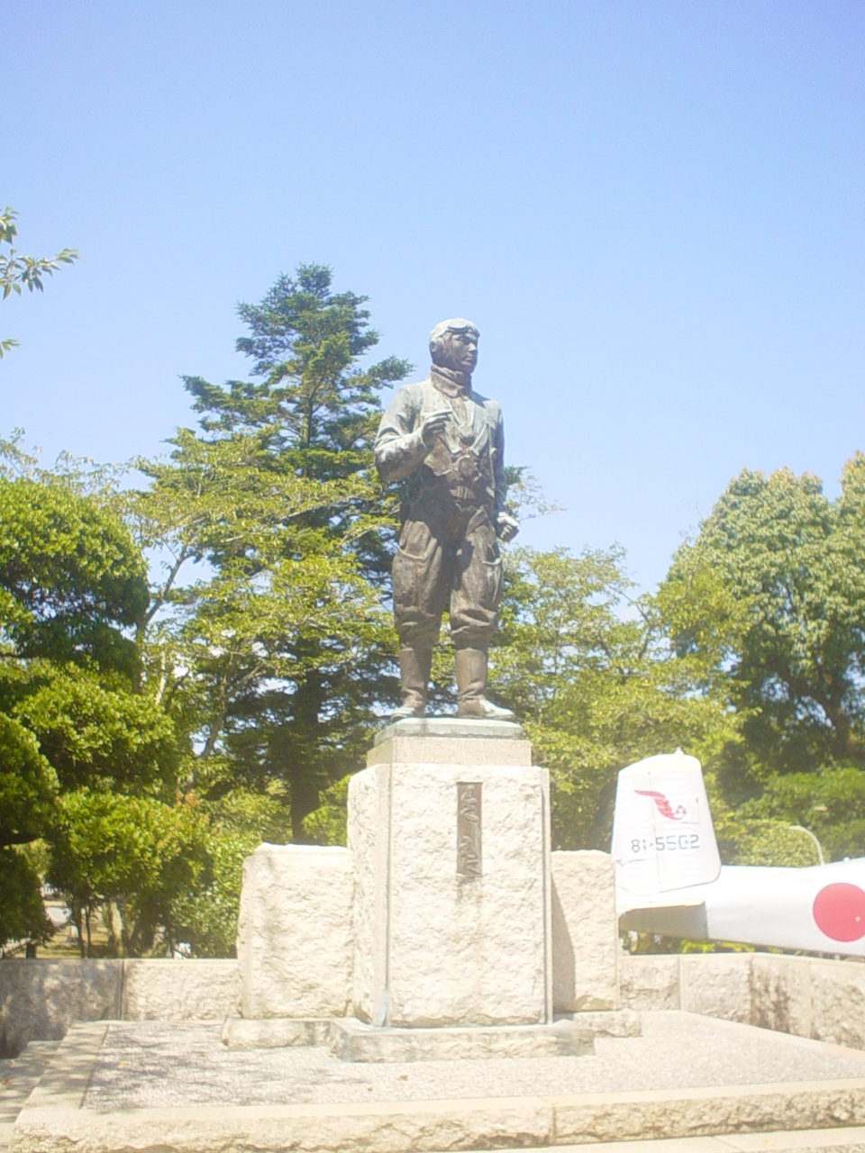 特攻出撃の街、知覧の特攻平和会館一帯を平和公園としています。特攻隊員勇士の像があります。右手は握手を求める形で平和を表します。左手は軍刀に手をかけ、こぶしを握っています。パンフレットでは決意を表すとしてありましたが、ガイドさんははっきり「戦争」を表すといいました。