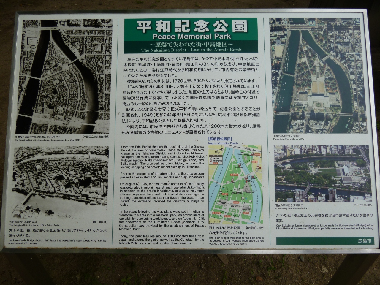 公園内には現在改装中の広島平和記念資料館や、国の追悼の為だけの施設国立広島原爆死没者追悼平和祈念館、柔らかい曲線の原爆死没者慰霊碑などの多くの慰霊碑や記念碑が点在しています。