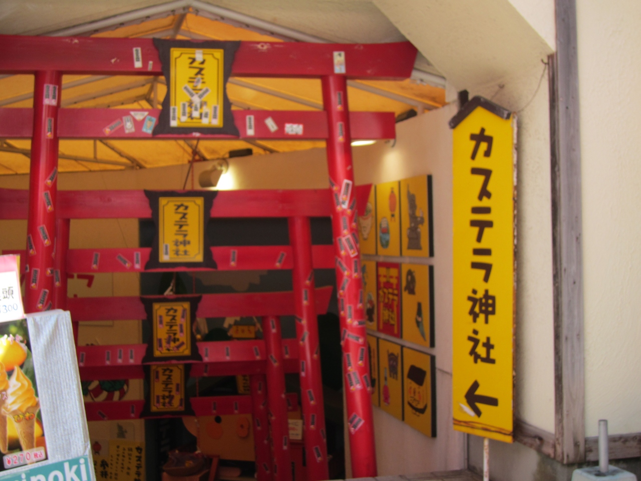 グラバー園を出て、お土産屋を探していると、なんと、「かすてら神社」が。さすが長崎ですね。観光客にうけていました。たくさんの人が記念写真を撮っていました。赤い鳥居がいくつも重なっているところなどは、本格的でした。見ることができて楽しい思い出になりました