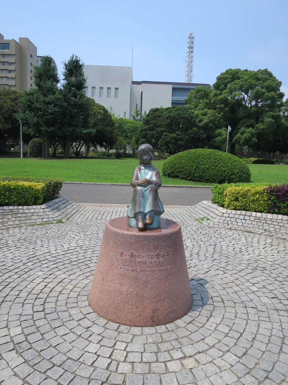 赤いくつ履いてた女の子の歌で有名な銅像ですね、山下公園のほぼ中央にあり良くわかります。