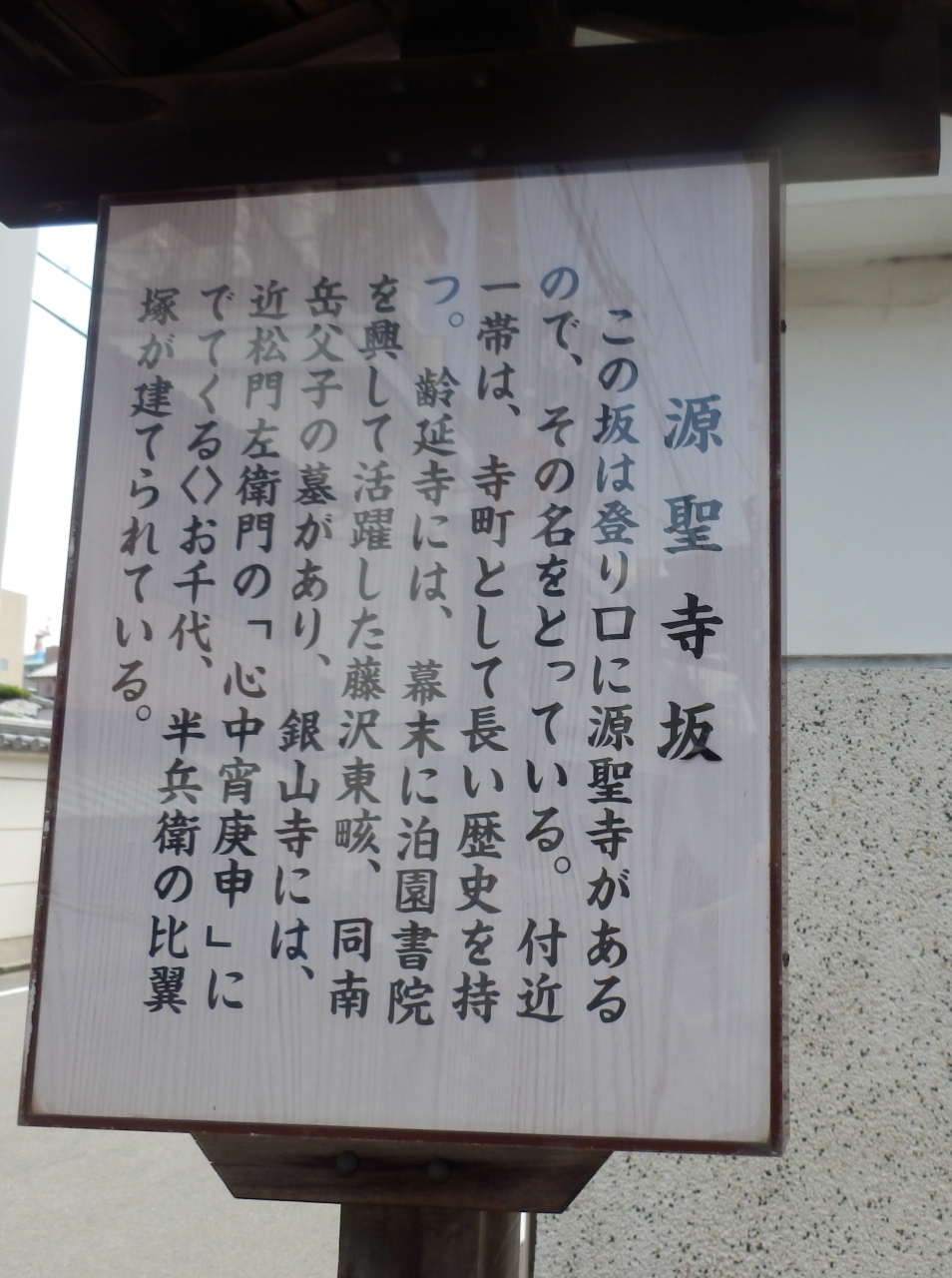 天王寺七坂( 北から、真言坂、源聖寺坂、口縄坂、愛染坂、清水坂、天神坂,逢坂を言います)巡り、二年前同行会の七坂ツアーに参加、今回は道順が判っているので単独で実施、所要時間三時間半で、出発の真言坂から最後の逢坂まで到達できた、途中の生玉神社、大江神社,安居神社で小休止を含む.この坂を下り終わった松屋町筋に源聖寺があるのでこの名が付けられたとされています、七坂の中で一番の急坂で石畳の階段になっていました