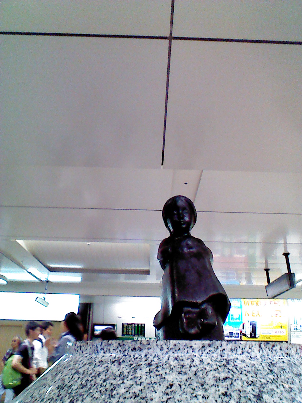 JR横浜駅中央改札を出て、少し東口側に行った通路のやや熱海寄り側にあります。結構、待ち合わせに使っている方が多いようでした。横浜らしさ一杯の像を駅の通路に置くのは良いことだと思いますが、小さくて目立たないのでもう少し大きな像にすればよかったのにとも思いました。