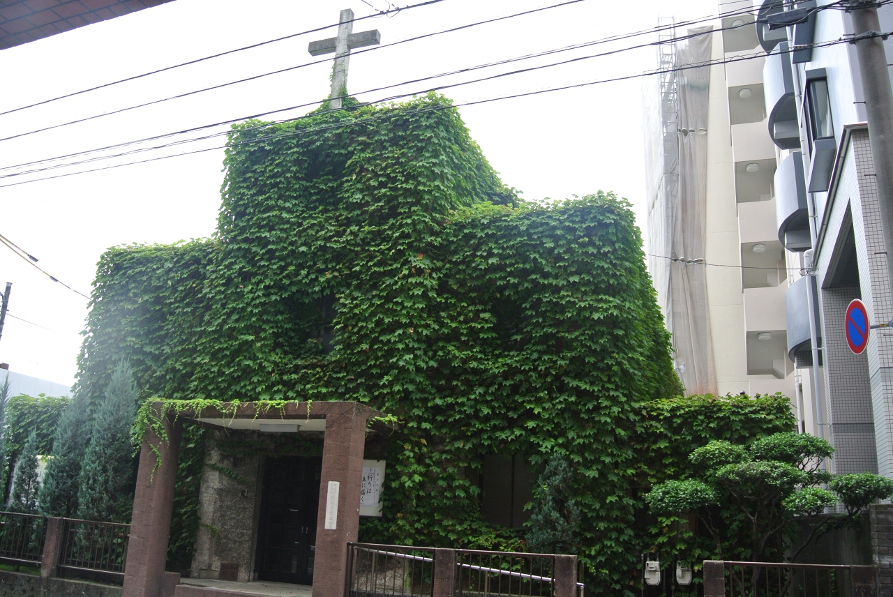 とてもシンプルなデザインの教会ですが、印象的的なのはなんといってもその表面いっぱいを覆うツタの葉。建物の壁面そのものが見えないぐらいですが、そのおかげで、よけいに建物の形が強調されているように思います。定礎に昭和3年とありました。