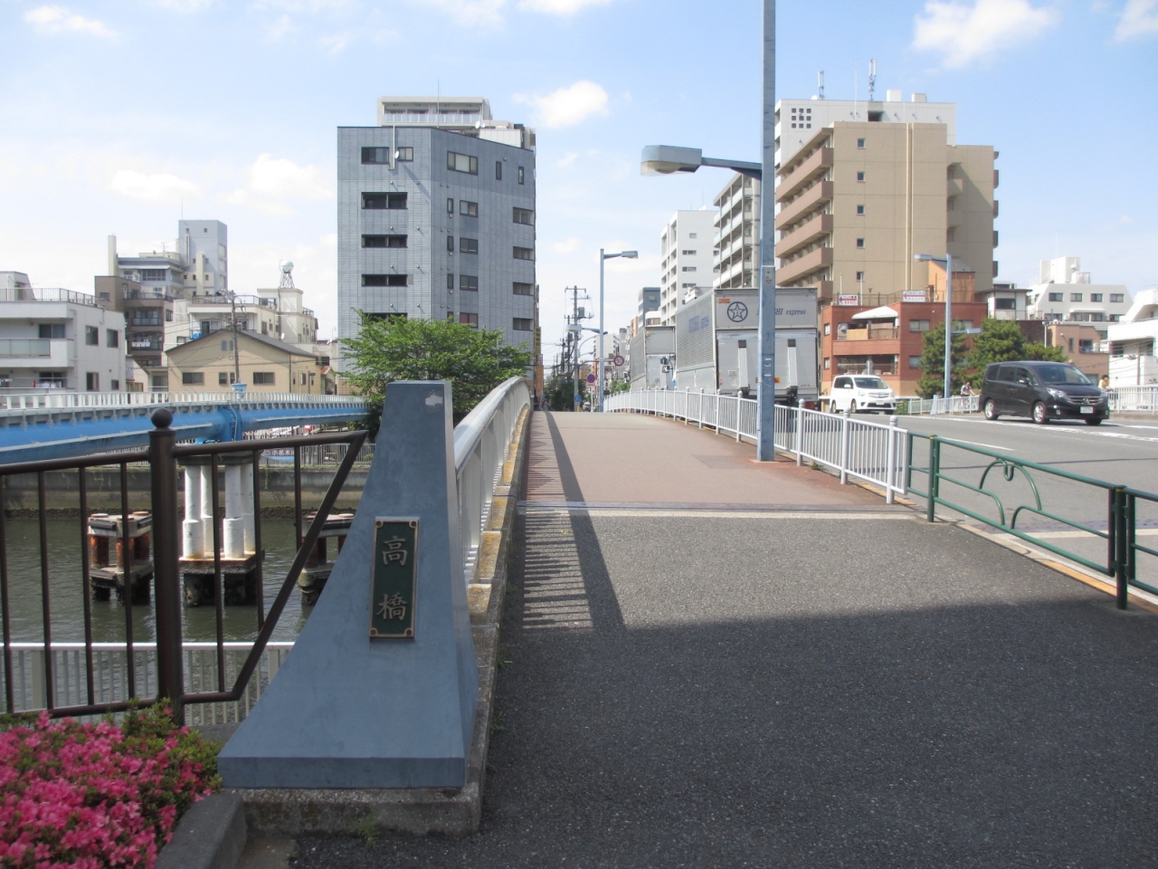「たかばし」と読みます。清澄白河駅A1出口を出て清澄通りに出てすぐのところを流れる小名木川に架かる橋です。昔は富士山の見える名所だったらしいですが残念ながら今は見えません。しかし、川沿いの散歩は今でも楽しめると思いました。