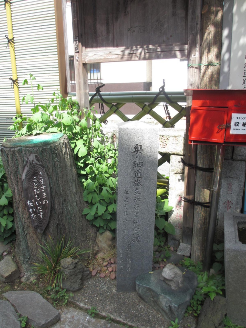 小名木川に架かる萬年橋の近くにある芭蕉稲荷神社の境内に立っている碑です。お子の細道に旅立って300年を記念して平成元年に建てられた碑のようです。近隣には記念館など芭蕉に関連するものが多くあるので、芭蕉ファンのかたはこちらも合わせてご覧になられてはいかがでしょうか。