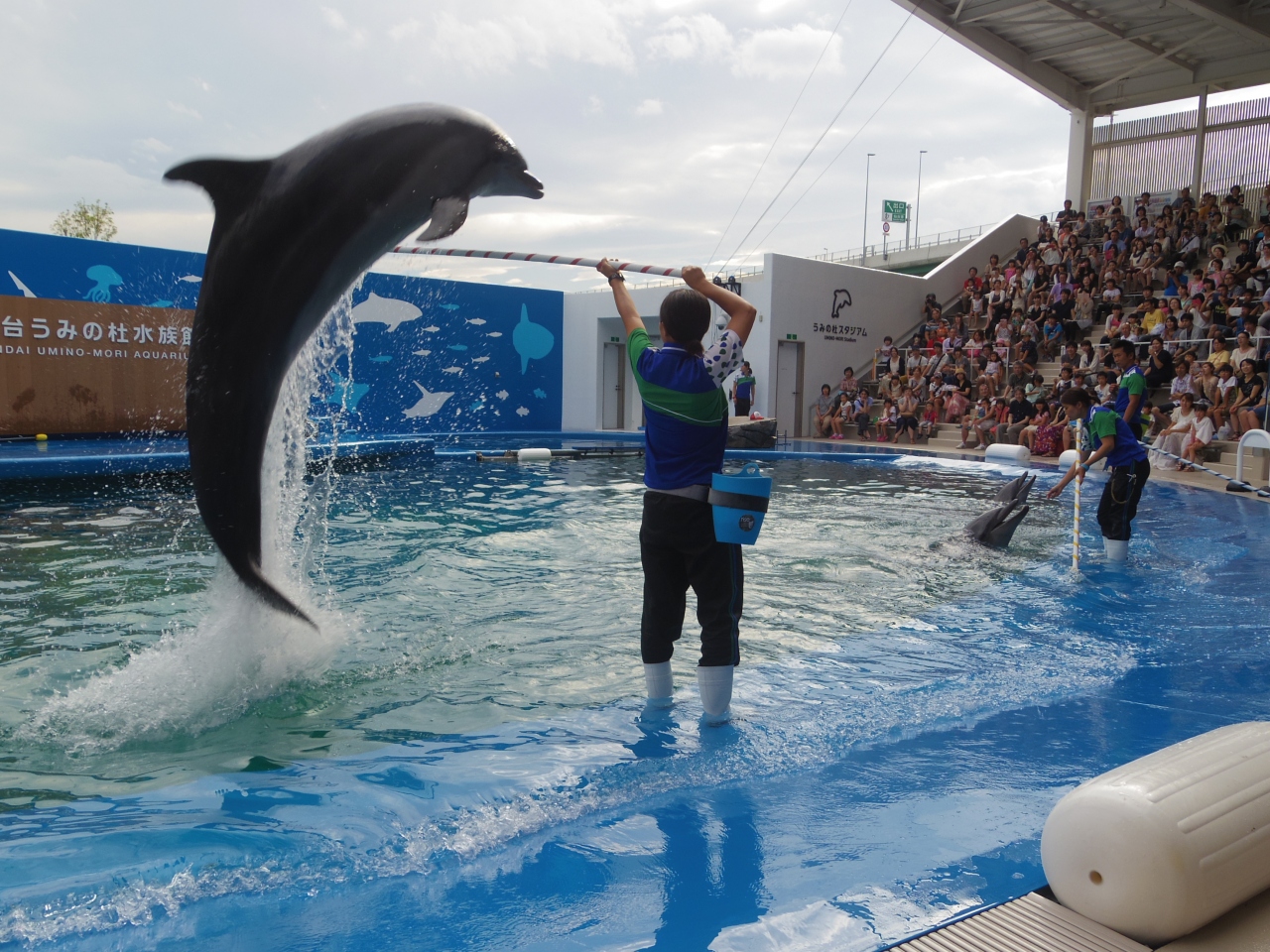 イルカのプールは小さくて、よくこんなに狭いプールで高くジャンプできるな、と思いました。プールが小さいだけに、どこに座ってもよく見えると思いますが、ショーの20分前ぐらいに行くと、ショーの時間以外は入れないようにしている前の3列が開放されて最前列で見ることができました。最前列にいるとイルカがプールの縁に飛び出てきて目の前に横たわるので面白いですが、ジャンプの後、水かぶりました。何度も水かかりますと言われて、承知の上で座りましたが、すぐタオルを持ってきてくれました。