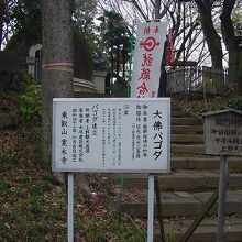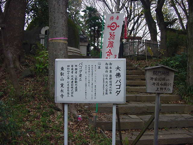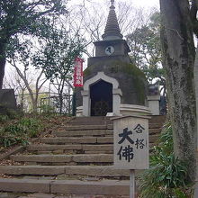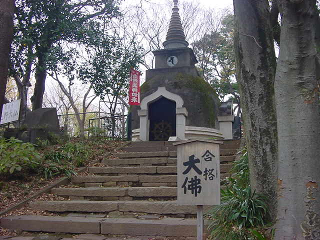 上野公園の中にある通称大仏山。ここにはかつて大仏殿があったそうですが、地震や火災によって倒壊してしまい、現在はパゴタ(仏塔)が建立されています。現在は大仏の顔だけが保存されています。合格大仏とあちこちに書かれ、受験祈願で来る人も多いようです。