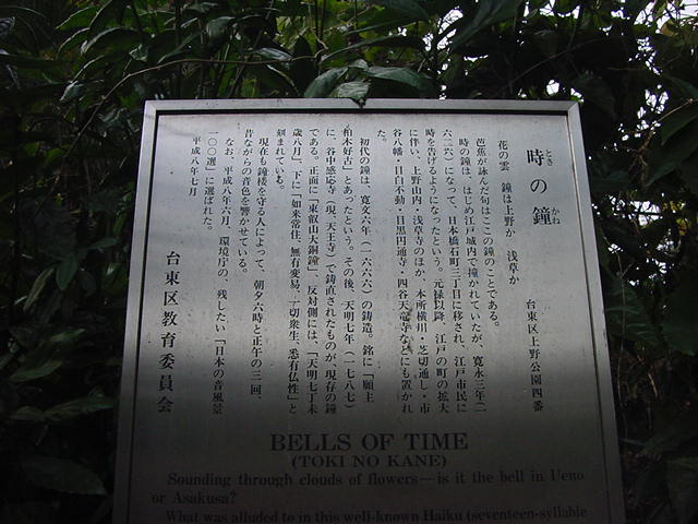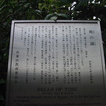 上野公園の中、上野精養軒の入口の脇に設けられた鐘で、1666年の建立だそうです。江戸の市民に時刻を知らせていた「時の鐘」で、いくつもあった時の鐘の中でも上野のものは「花の雲鐘は上野か浅草か」と松尾芭蕉に詠まれたほど馴染み深いものだったそうです。