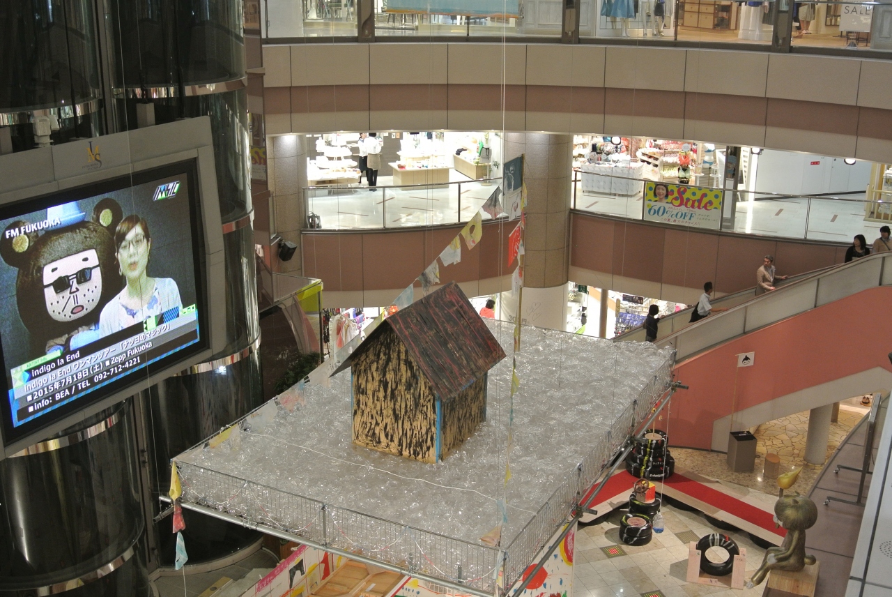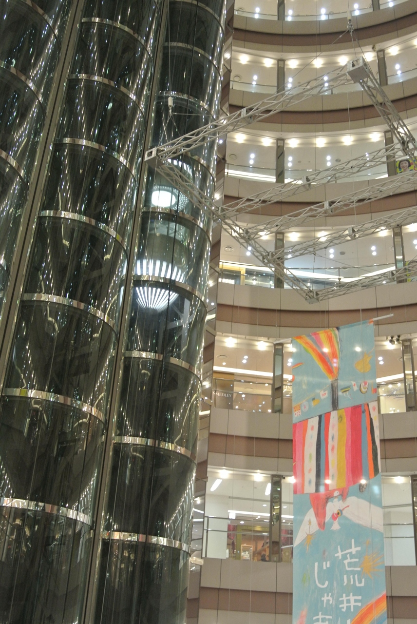 天神渡辺通りに面しているファッションビルです。ゴールドの外壁、吹き抜けの店内、透明なエレベーターなど、なかなか斬新なデザインと造りのビルだと思いました。吹き抜けのホールには変わったオブジェも。夏のセール中でした。
