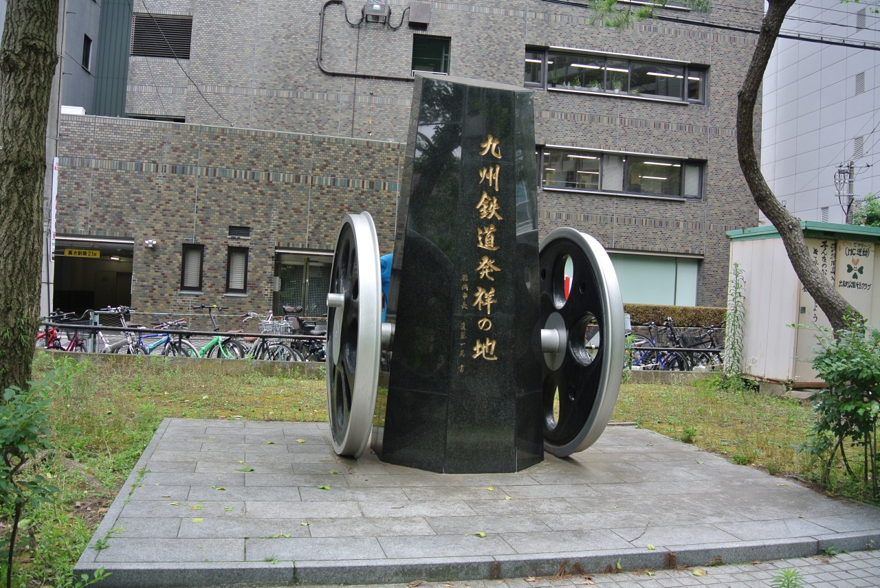 博多駅からもほど近い出来町公園内にあります。最初の博多駅はこの公園内にあったそうで、九州鉄道開通90周年を記念して建てられた記念碑だそうです。車輪を模したオブジェですが、公園全体の整備が待たれるところです。
