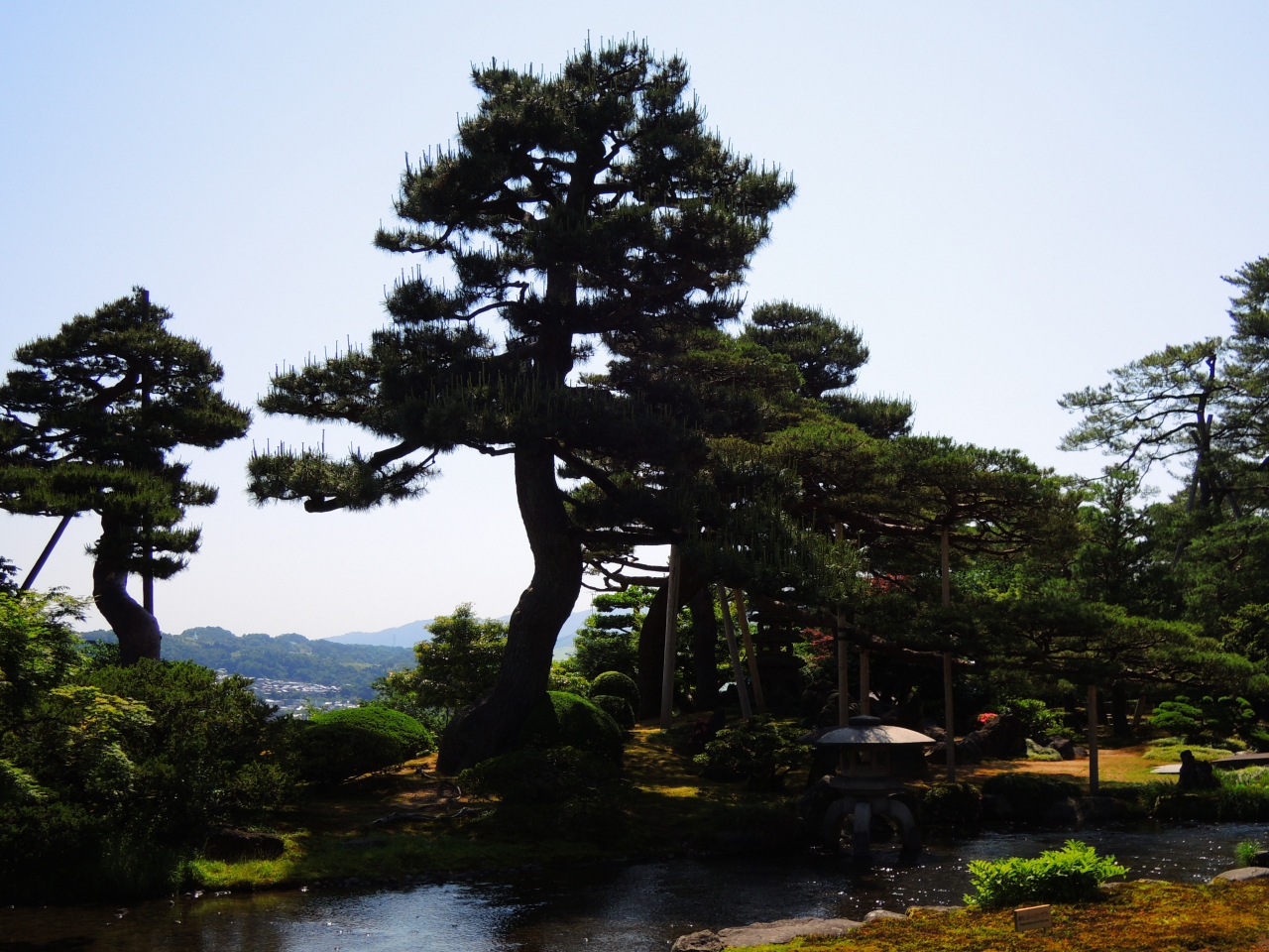 曲水が流れ雪見橋正面の七福神山中央に立っている赤松が巣ごもりの松です。
