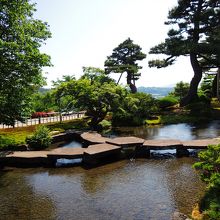 数ある兼六園の石橋でもここが一番印象に残っている橋で浅い曲水に薄い石を採用したのも優れているところだと見入ってしまいました。
