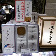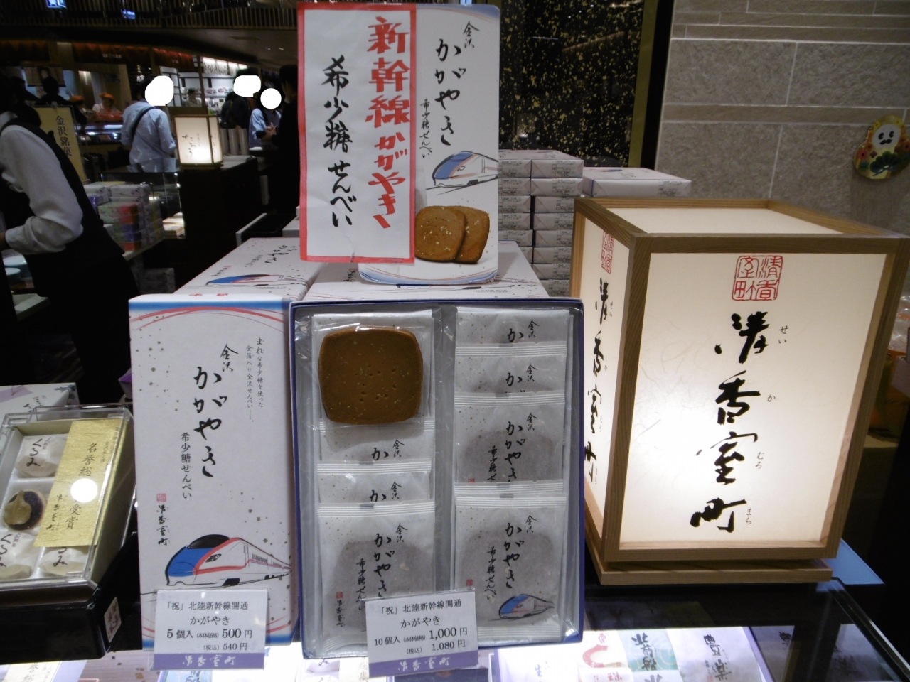 「清香室町 (金沢百番街(あんと内)店)」でなんか土産になるもんがないかと探していたら、ちょうど北陸新幹線の絵が入った菓子があった。太らないだけでなく血糖値の上昇を抑え、内臓脂肪の蓄積まで抑える作用がある希少糖を使ったせんべいがあった。高価なせんべいだがおやじたちにうけた。