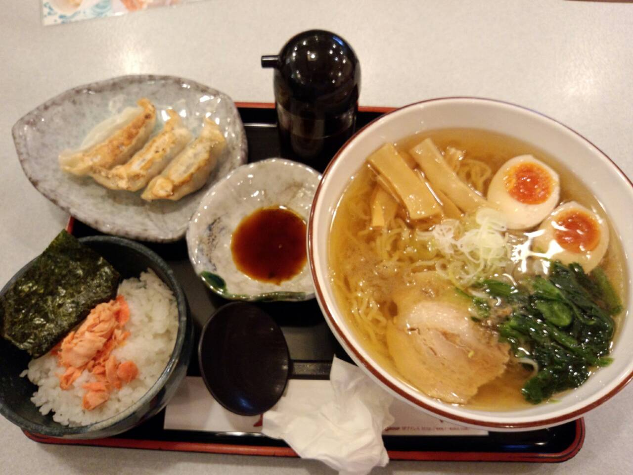 ラーメン好きなので迷わずこの店に決定しました。味玉ラーメンセットを注文。味玉ラーメンに餃子が3個、それに鮭フレークの乗ったごはんでボリュームがあります。