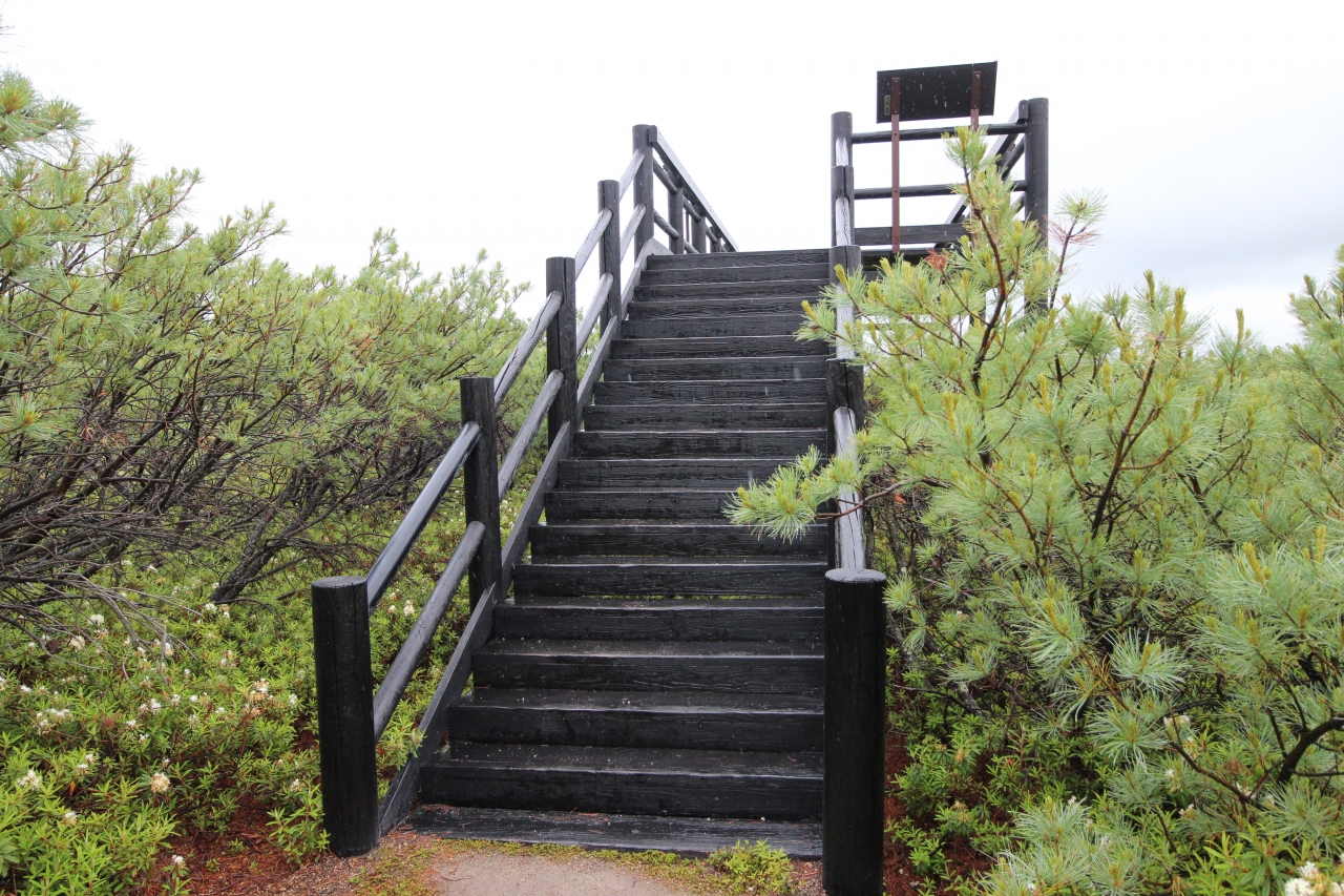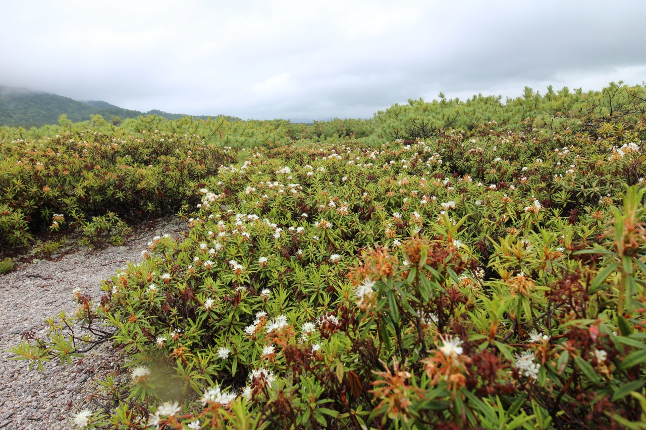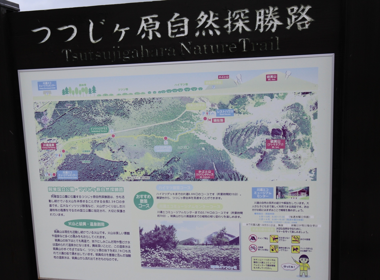 つつじヶ原自然探求路は、硫黄山レストハウスから川湯温泉の川湯エコミュージアムセンターまで2.5km遊歩道。この遊歩道のセールスポイントは6月中旬から下旬にかけて咲くイソツツジ。6月の終わりに訪れたのですが、イソツツジの見頃は終わってました。今年は、5月に暖かい日が続き、例年より2週間早かったようです。当初の計画では、イソツツジが白く咲き誇り、その背後に硫黄山が噴煙を上げる、そんな図を見れるはずでしたが、残念でした。