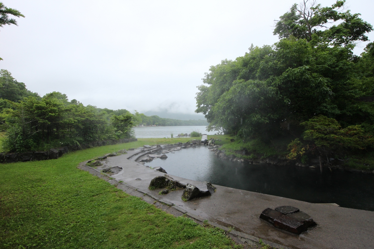 6月の終わり、その日の宿である屈斜路プリンスホテルに向かう途中、和琴温泉露天風呂(無料)に行ってみました。石垣を隔てただけの湖畔沿いに、かなり広い湯船の露天風呂があります。脱衣場もあり、誰もいなかったので、入ってみようかとも思いましたが、雨ふりだったので、見物するだけにしました。湖畔近くでロケーションはすごく良いのですが、かなりのオープンスペース状態で、入るというより、眺める露天風呂という感じです。実際夏場は、水着を着た子度たちの遊びとなり、それを観光客が眺めているという風になるようです。