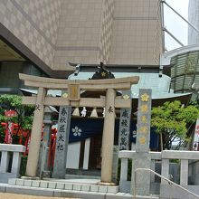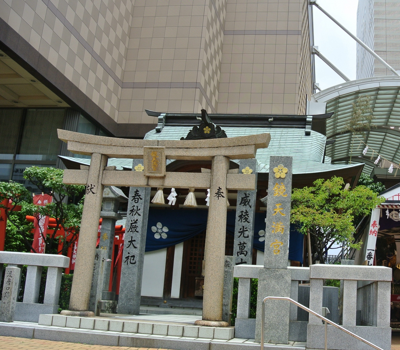 福岡リバレインの一画にある小さな社で、博多川に面しています。川を隔てたところには同じく菅原道真公をおまつりした水鏡天満宮もあります。どちらも、左遷され京都から九州に着いて、自分の姿を見たという故事から名前がついているようですね。