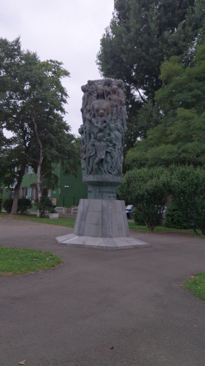中島公園にあるモニュメントですが、完全に芸術作品でひときわ目立つ独創的なデザインで、人間が360度 様々な方向を見つめておりますが、自分はこのブロンズ像を見て、この世の中には多種多様の人間がいて、様々な生き方をしていること、人は人なしには生きていけないことなどを、この像を見ていると強く感じました。人がこのブロンズで表現されていますが、表情豊かというよりは、表情を読み取ることはできないですが、むしろ表情のない人間から、これを見た人が何を感じるかを追求しているようなブロンズだと感じました。