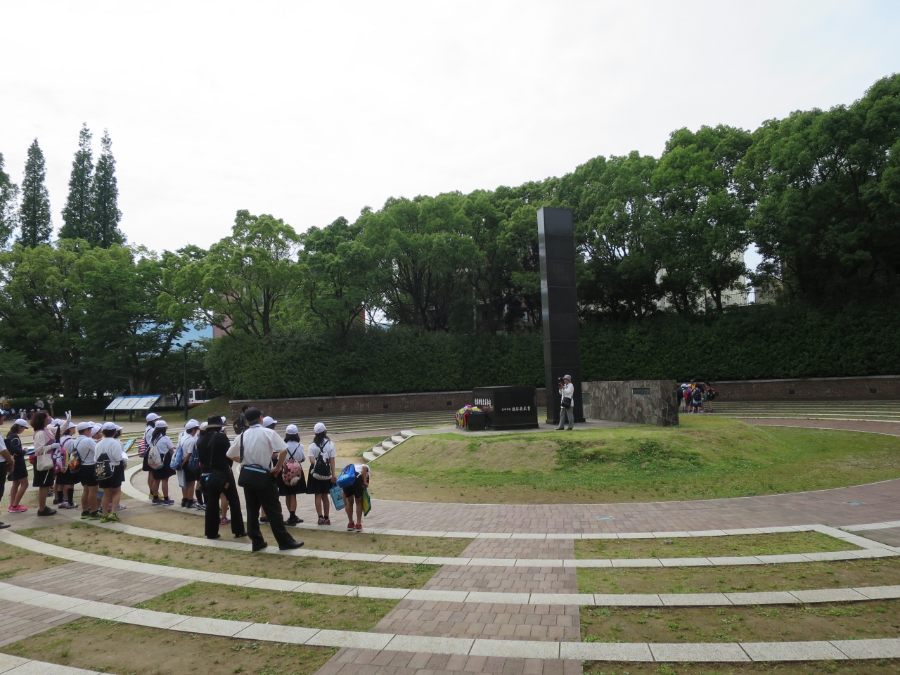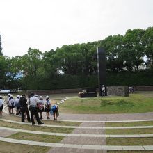 平和公園のすぐ近く、路面電車の停留所からはほど近い場所にあります。公園の片隅に立つ一本の石柱が、この上空で原爆が炸裂したことを今に伝えています。周りは市街地が広がり当時を思い起こすようなものはありませんが、ここには近くにある被災した浦上天主堂の残骸の一部が保存されています。