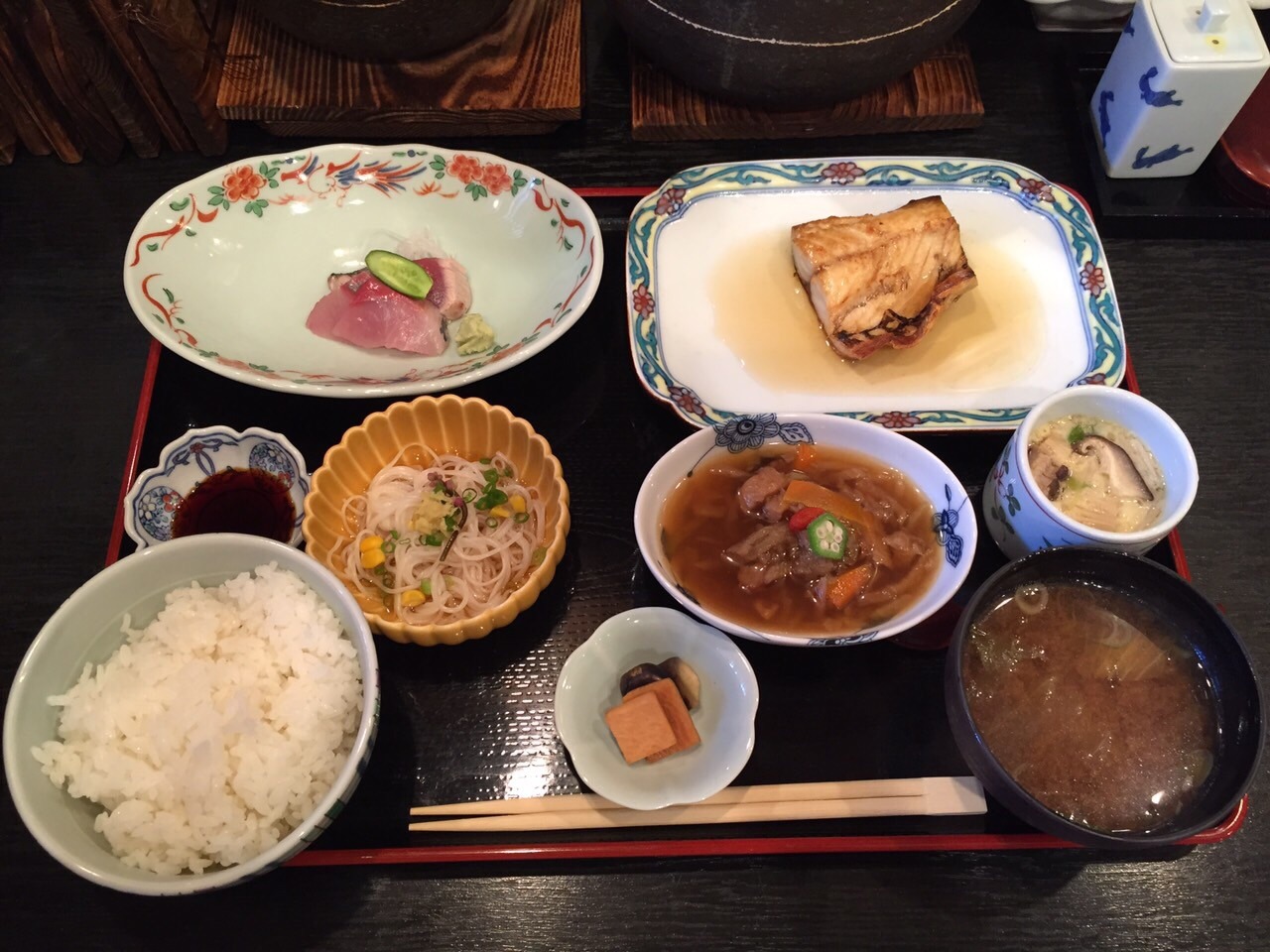和食膳を注文。1000円なので、それなりかな?などと思っていたら、とても豪華。お造りやら、煮魚やら、小鉢やら。そして、どれも美味しい。