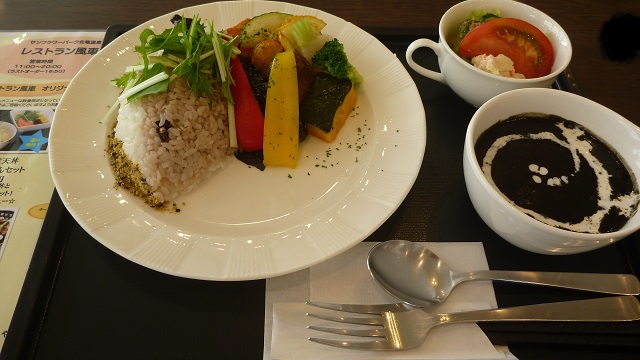 道の駅サンフラワー北竜内にあるレストラン。ご当地ならではの素材を生かしたメニューが充実している印象だったので入店してみた。提供される米や野菜は北竜町産とのことで、もう一つの名産である黒千石という豆を利用したメニューが印象的。黒いカレーを注文する。素揚げされた野菜は味わいがあっておいしい。スパイスも絶妙で満足のいく昼食をとることができた。
