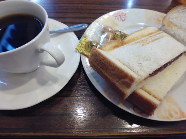 名古屋名物のモーニングを朝だけでなく一日中食べさせてくれるというので寄ってきた。小倉のトーストにコーヒーそれに小さな豆菓子がついてました。
