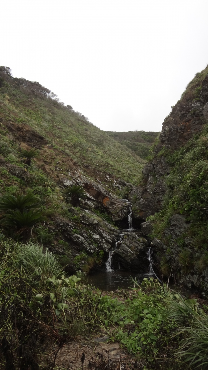 台風の雨上がりだったので、急峻な谷から、海に向かって流れ落ちる滝が、