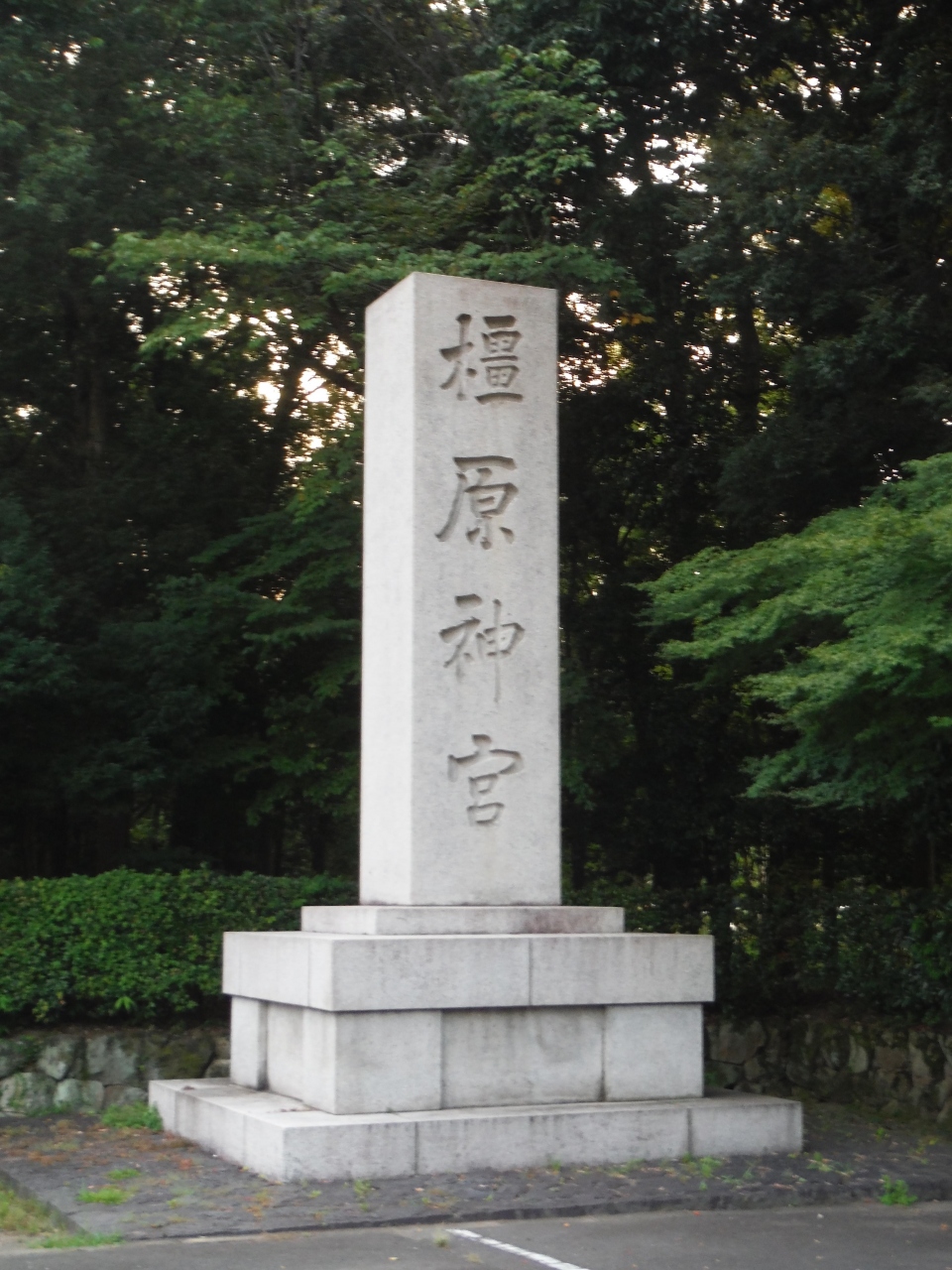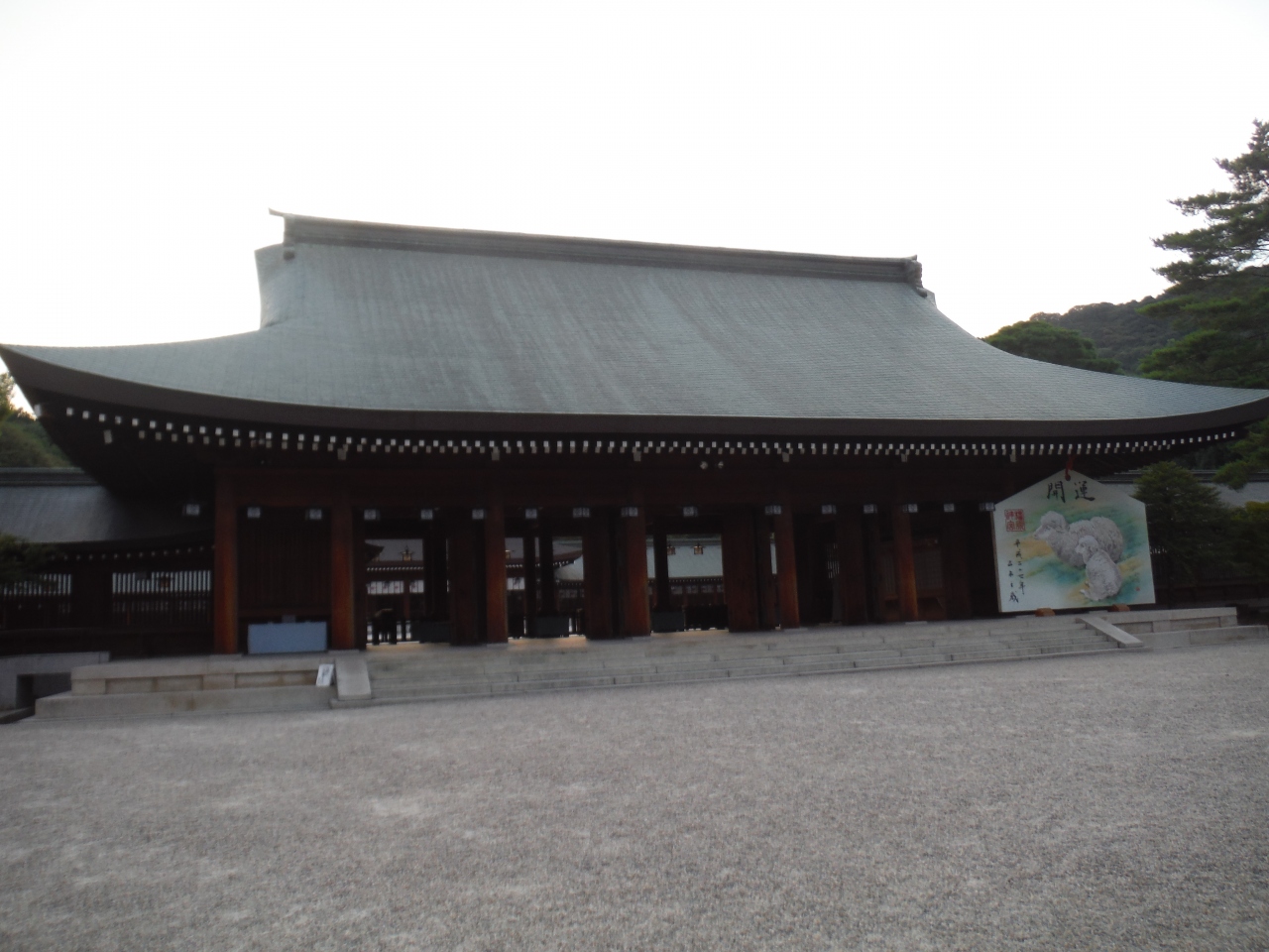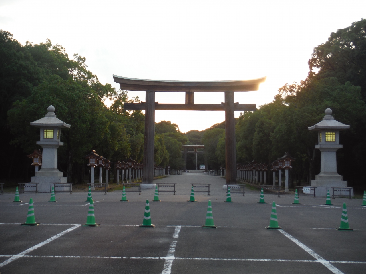 近鉄の橿原神宮駅から歩いて10分位。御祭神は初代の天皇である神武天皇とその后の五十鈴媛皇后。橿原神宮駅を出ると一直線の道が神宮に向かって伸びています。大きな木の鳥居を二つくぐっていくと手水舎があり、右手に進むと拝殿に行けます。拝殿の奥に本殿があり、鏡が見えました。