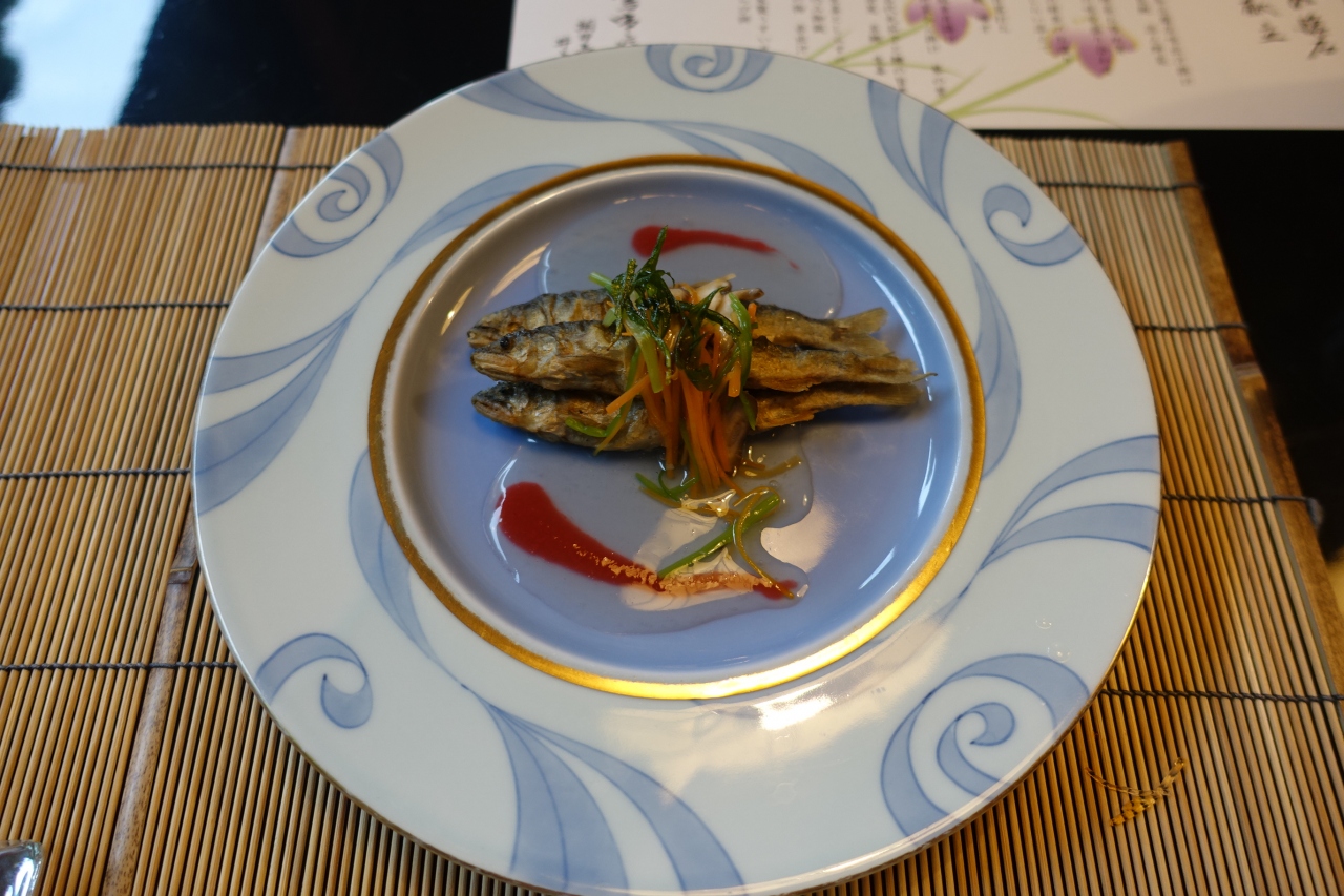 焼き物 若鮎皐月揚げ(彩り野菜あん掛け 蓼の葉 梅肉)