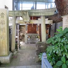小さな祠が橋を渡った所ににあり、鳥居手前右手には松の木が植わっています。こちらはガイドブックにも載る縁結び、縁切りで有名な明神で、縁結びは左の大きい社、縁切りは右の小さな社だそうです。くれぐれもお間違いの無い様お参り下さい。