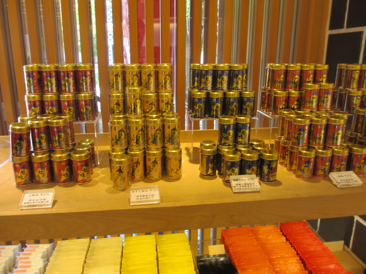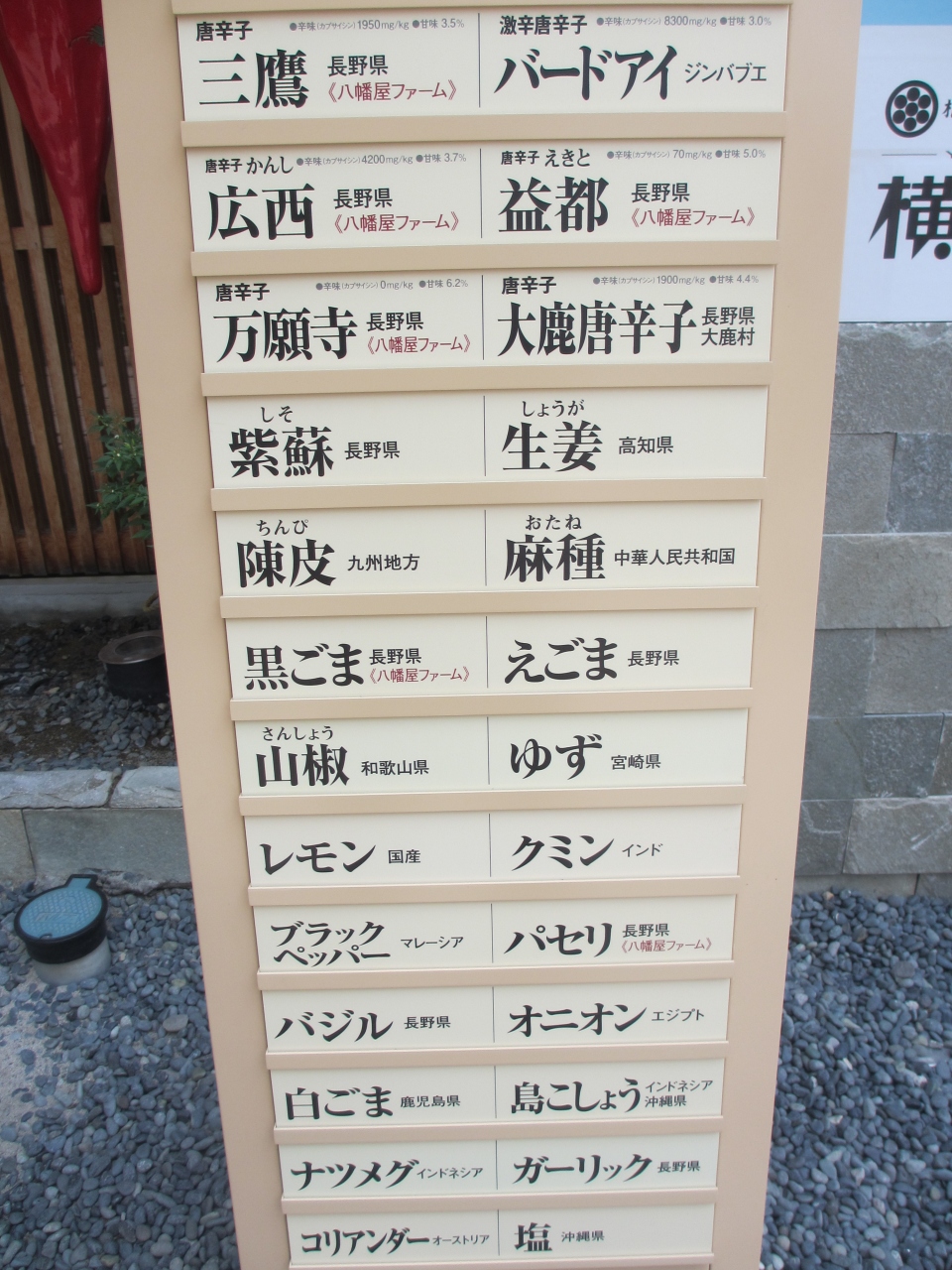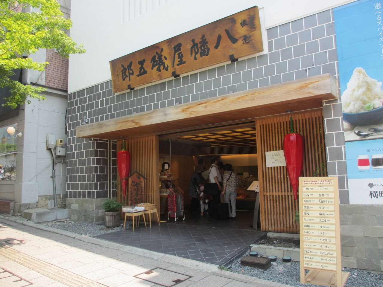 善光寺参道にある七味唐辛子専門店です。麺にかける一般的な七味唐辛子、辛さの度合いが異なる物、ゆず唐辛子など珍しい物、唐辛子せんべいなど見るだけでも楽しい品が揃っています。店内奥に、横町カフェがありかき氷が食べられます。