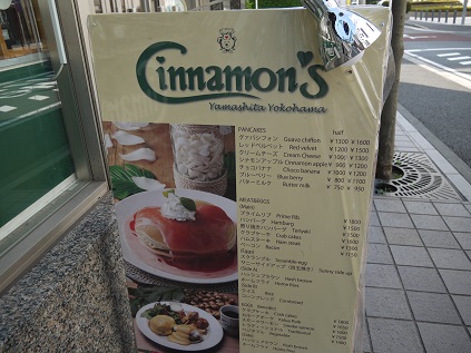 みなとみらい線の日本大通り駅下車、横浜開港記念館等レトロな建造物を見ながら、赤レンガ倉庫・山下公園を散策、小腹が空いた頃に見つけたシナモンズ、グアバパンケーキが有名なお店です。フルサイズ(4枚)で1600円、ハワイで食べた時よりもちょっと高めですが、ハッピーアウアーの時間帯はアルコール系が超お得価格です。
