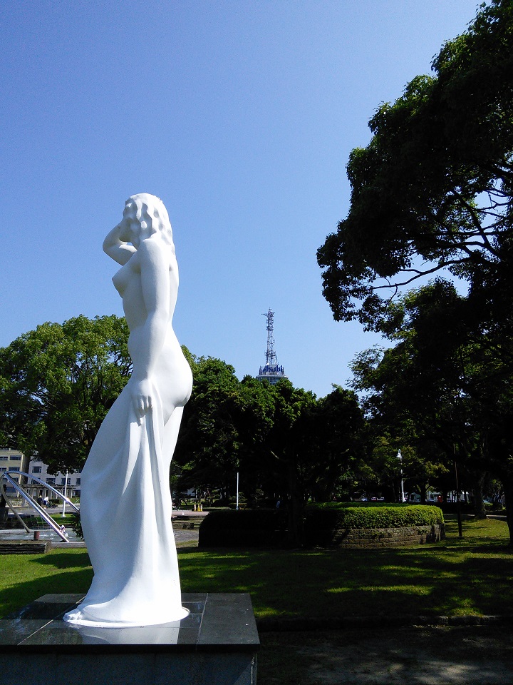 別府タワーが木々の間から顔をのぞかせて彫刻などが置かれた市民公園でございます。