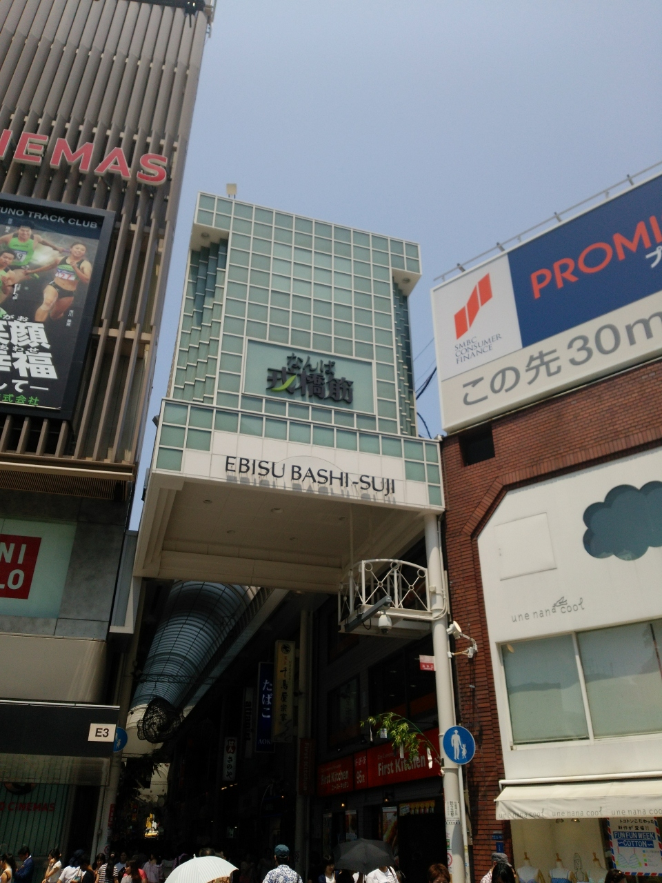 戎橋筋商店街は、なんば駅前の島屋大阪店から道頓堀川に架かる戎橋まで(御堂筋の一本東側)のアーケード型の商店街です。近年、地方都市のアーケード型商店街は閑散としているところが多い中、この商店街はお店も多く、活気があり、たくさんの人で賑わっていました。