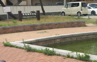 皆生ベイサイドスクエアや華水亭などの温泉ホテルに挟まれた小さな公園。目の前は皆生温泉海水浴場と海沿いの遊歩道となっております。真ん中に水の流れる空間がありますが人工の流れか自然のものかは分かりませんでした。
