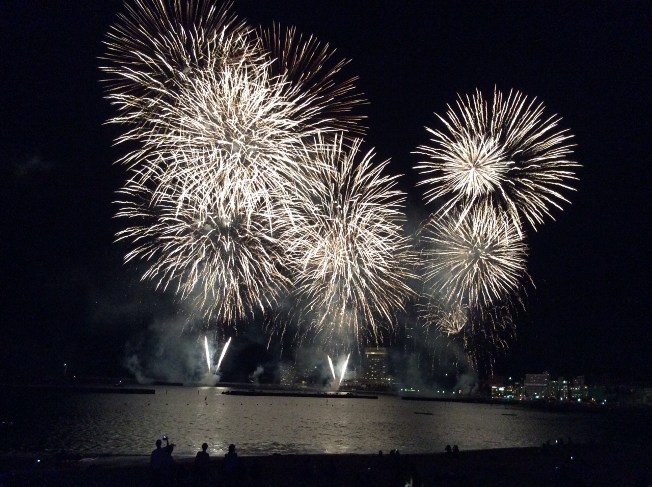 夏の熱海の海岸で行われた花火大会でした。ビーチに下りて砂浜から見上げる形で楽しむことができる花火大会で、大きな尺の花火は頭上から降り注ぐような感じで迫力がありました。人混みもそれほど酷くなく、規模は大きくないですが首都圏の花火大会より楽に観覧できます。