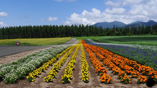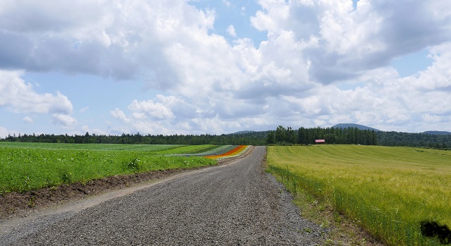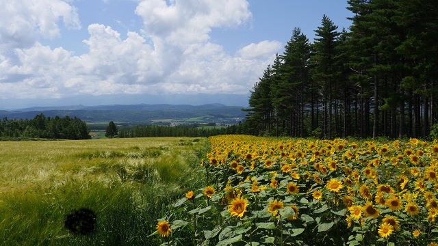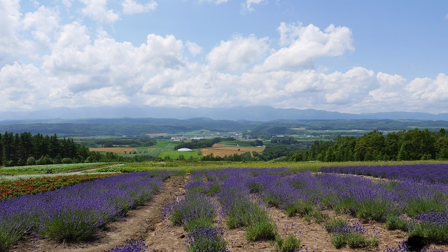 富良野駅前からほぼ上り坂を自転車で。熱中症になりかけながらもあきらめずに来てよかった。展望台からの見晴らしもよく、花々も最盛期ですばらしかった。梅雨のような天気が続く中、奇跡的に晴れた一日でやはりこういった景色は青空の中で眺めるのが最高である。