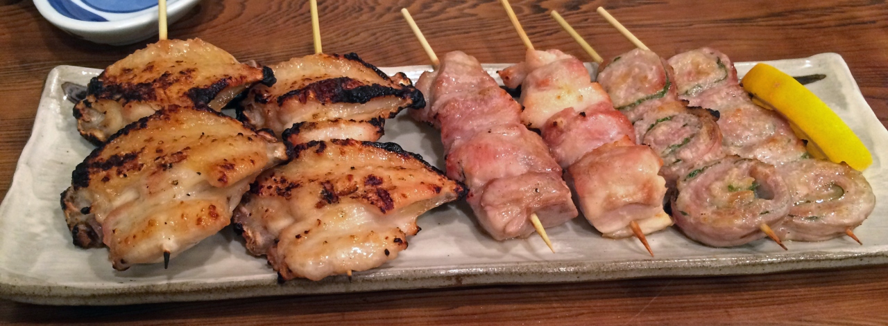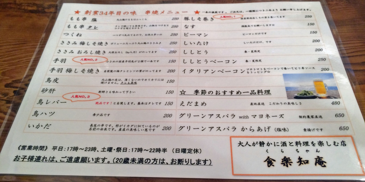 あけぼの橋通り商店街にある焼き鳥屋 食楽知庵で、美味しいやきとりをいただきました。