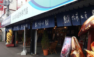 札幌駅から地下鉄東西線で二十四軒駅へ。そこから徒歩7~8分の場外市場通りの少し奥に佐藤水産市場店はあります。入口に蟹やエビの大きなオブジェがあり観光客を迎えます。海産物加工品の品揃えが多く、自宅へ配送する人も多いみたいです。