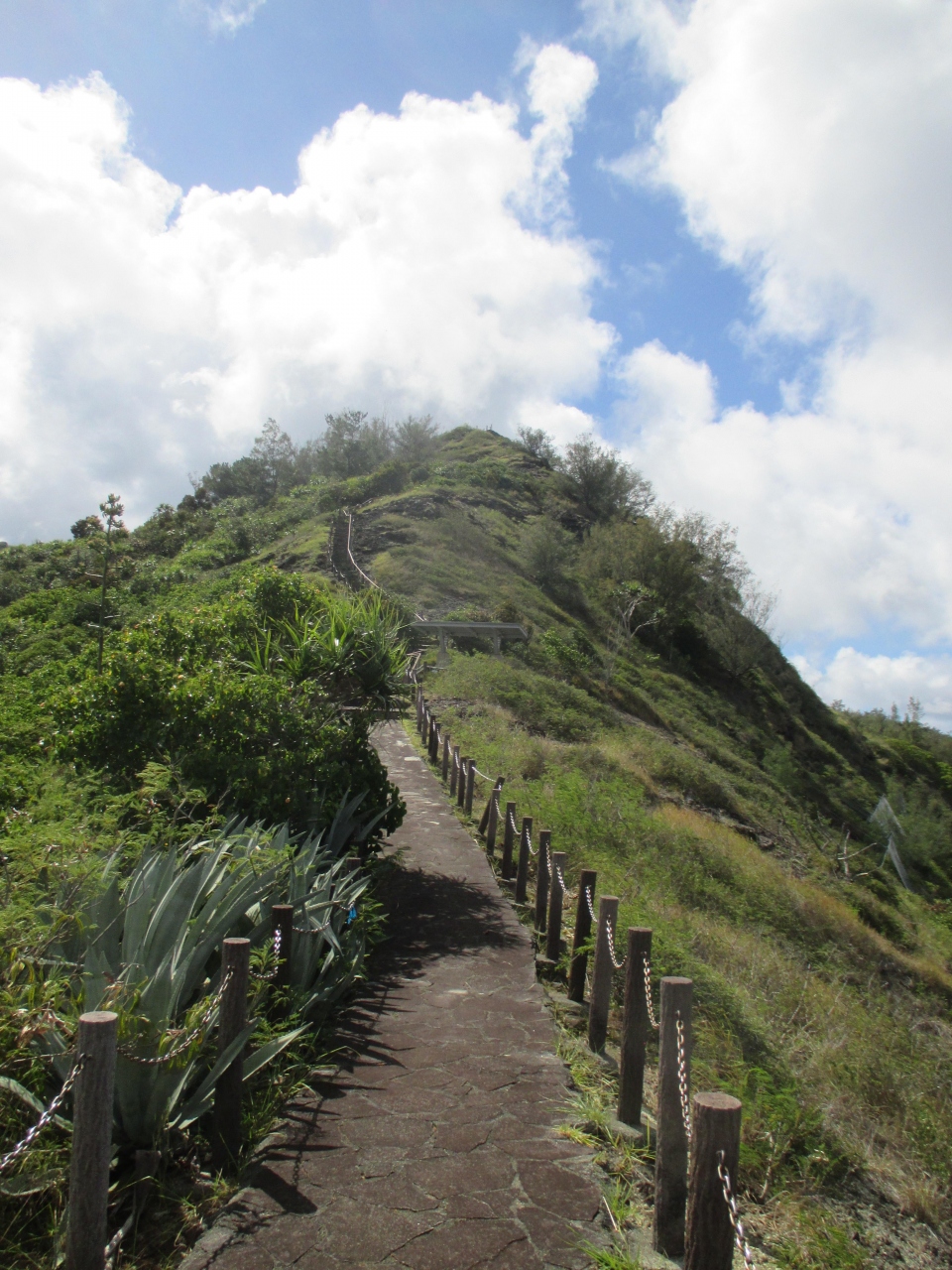 見晴らしが良いのでまた見たいものだが、上に登るまでが大変。360度景色が見え、海を始め小笠原高校方面も見ることができる。公園の中には戦跡のような小屋がある。登り口はさまざまなところにあり、1度目は大神山神社から入った。次は製氷海岸の帰りにトンネルの裏辺りから登った。他にはローカルベーカリー方面からも行くことが可能。昼間は暑いが、景色はきれいに見える。神社方面だが、夕方コウモリを見ることが可能。案外、双眼鏡がないと見づらかった。
