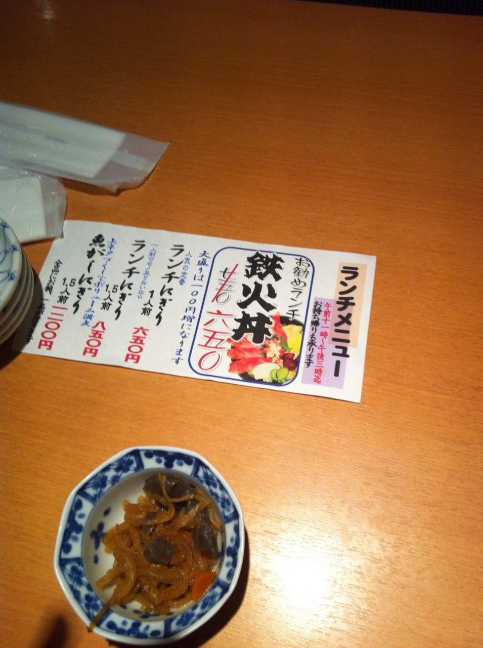 ランチは、鉄火丼やにぎり寿司が650円で食べられます。寿司は800円くらいの味といったところで、値段の割には、まぁいいかといった感じです。店内が落ち着かない感じである分、トータルで考えると値段相応でしょうか。
