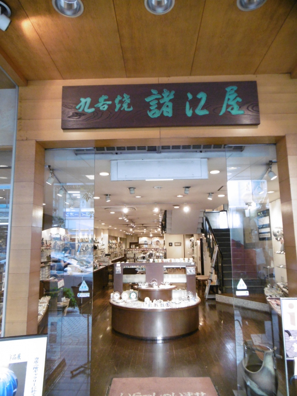 「九谷焼諸江屋」はプレーゴの横にあった。創業が文久二年というから、すでに150年以上の歴史がある老舗だ。九谷焼の有名作家作品は手が出ないが、普通に使える食器、アクセサリー、置物といったものも売っており、値打ちな商品もあるから安心だ。