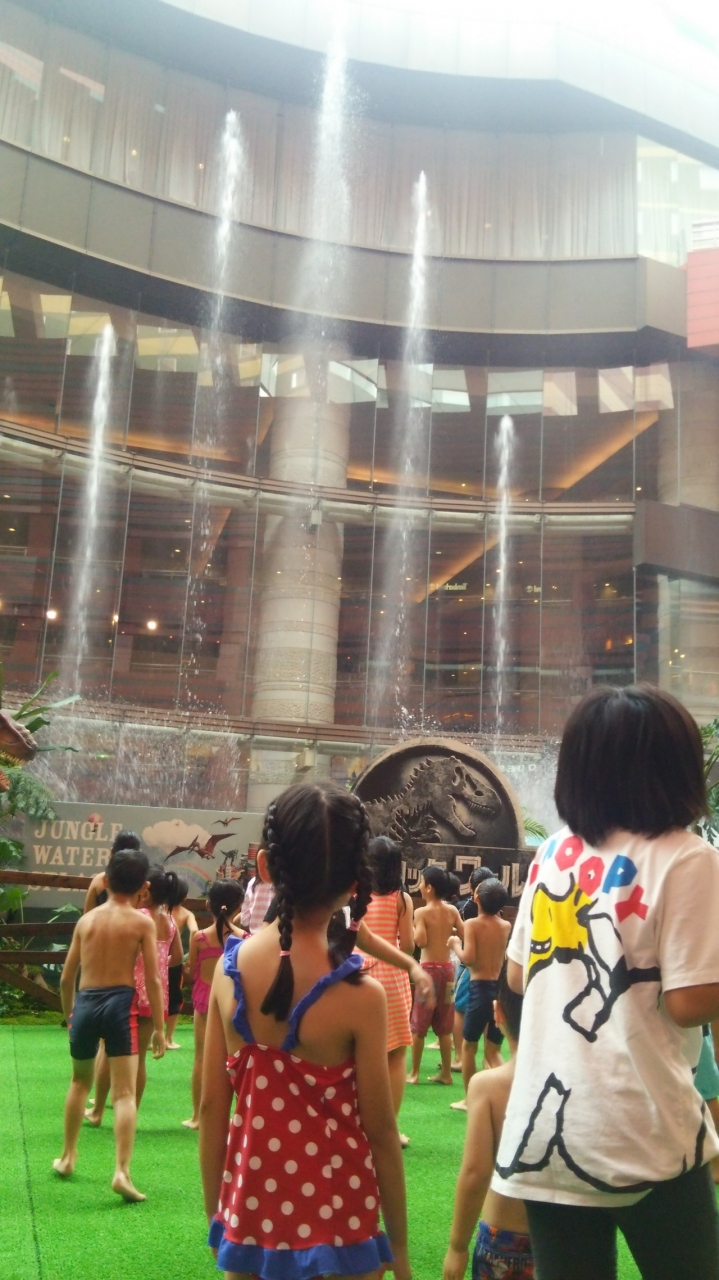 平日にでかけましたが、夏休み期間だったのでかなり親子連れが多かったです。水遊びが期間限定でできるので、水着で遊んでいる子供たちがたくさんいました。噴水ショーもあって迫力ありました!買い物もできるし、子供も遊ばせれてよかったです。
