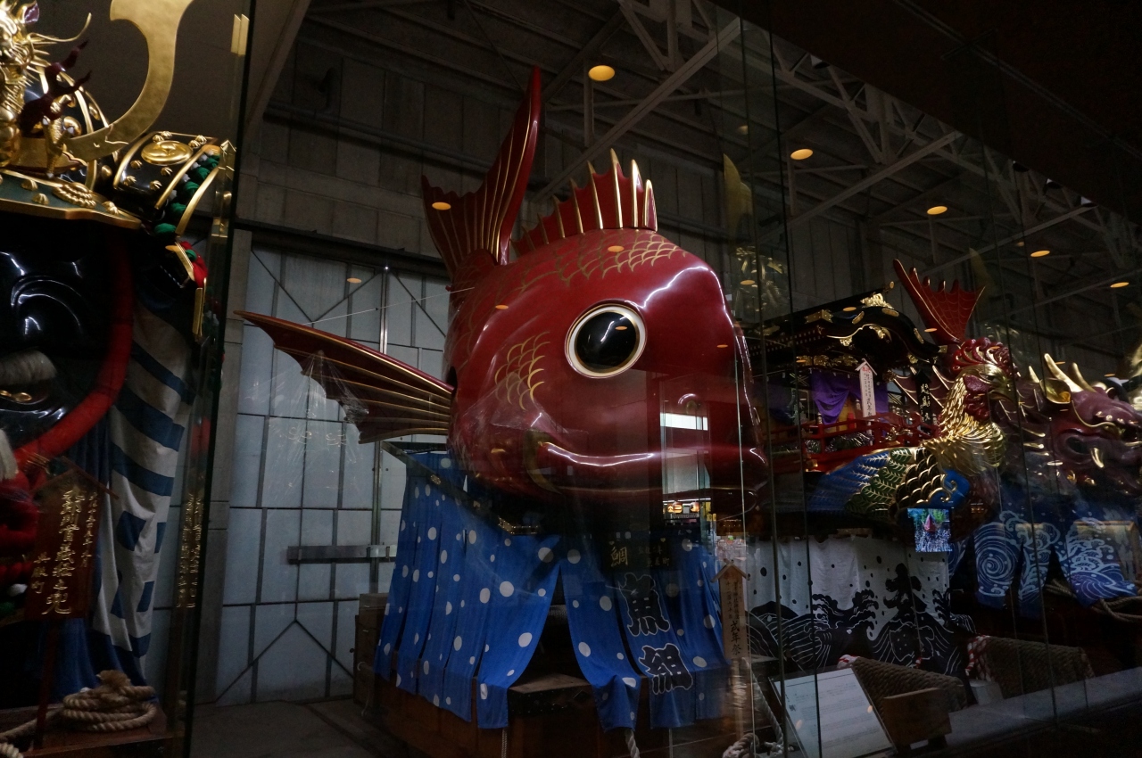 楽しかったです。この鯛や獅子が、練り歩くと思うと、うきうきしました。駐車場は建物の裏側にあります。扉の塗り替え作業のために、何体かビニールをかぶせてありました。そのため、入館料が無料でした。十分見学できました。
